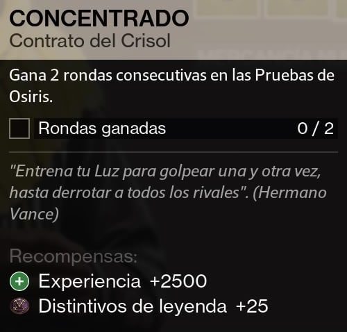 Para el Año 2 de Las Pruebas de Osiris han querido hacer las cosas diferentes y esta vez disponemos de 6 contratos para completar en estas pruebas. Cada uno de estos contratos nos darán un bonus de experiencia y una recompensa, que varia entre paquetes de Osiris y Distintivos de leyenda.