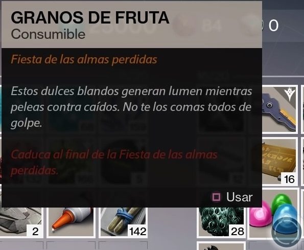- Granos de fruta: Estos dulces blandos generan lumen mientras peleas contra caídos. No te los comas todos de golpe.
