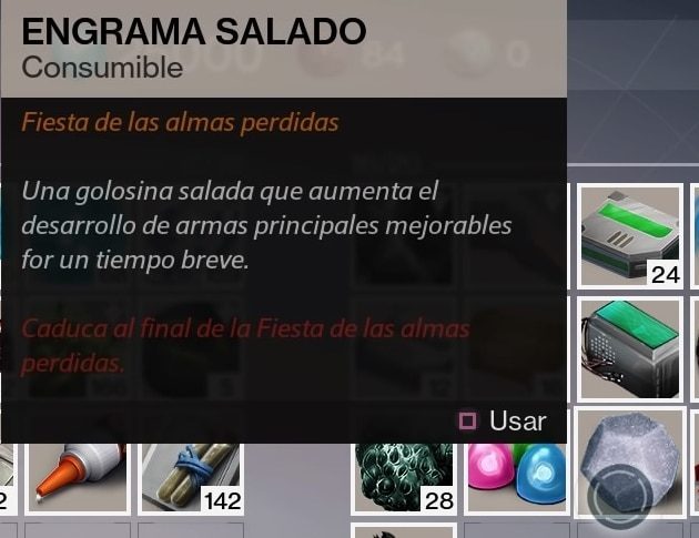 - Engrama salado: Una golosina salada que aumenta el desarollo de armas principales mejorables por un tiempo breve.