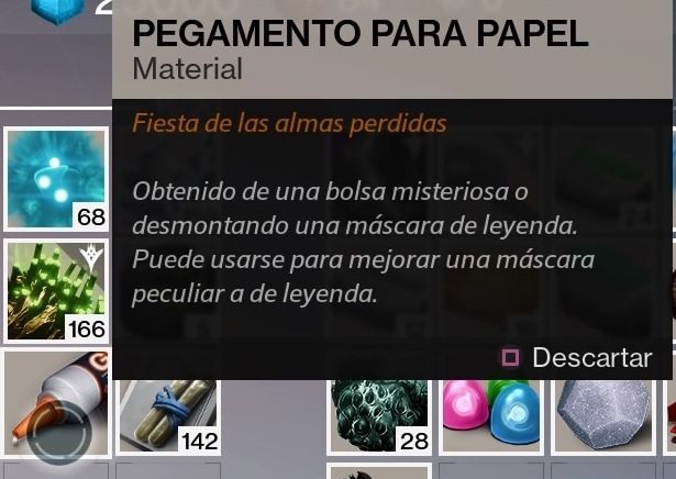 - Pegamento para papel: Obtenido de una bolsa misteriosa o desmontando una máscara de leyenda. Puede usarse para mejorar una máscara peculiar a de leyenda.