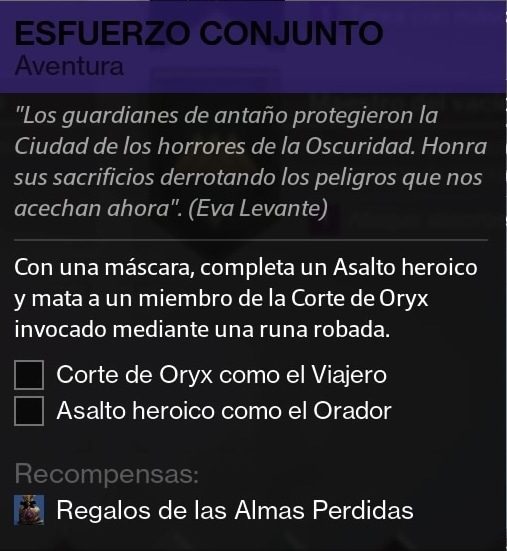 Con una máscara, completa un Asalto heroico y mata a un miembro de la Corte de Oryx invocado mediante una runa robada.